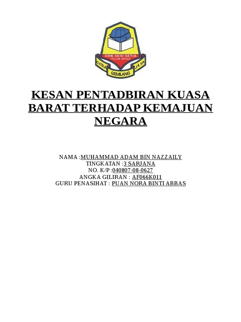 Rumusankesimpulan yang saya dapati dalam hasil kajian ini ialah saya dapat mengenalpastifaktor kedatangan kuasa barat ke alam melayu serta sejarah penjajahannya. Latihan kertas 1 soalan struktur soalan esei. Folio sejarah pt3 kesan pentadbiran kuasa baratterhadap kemajuan negara.